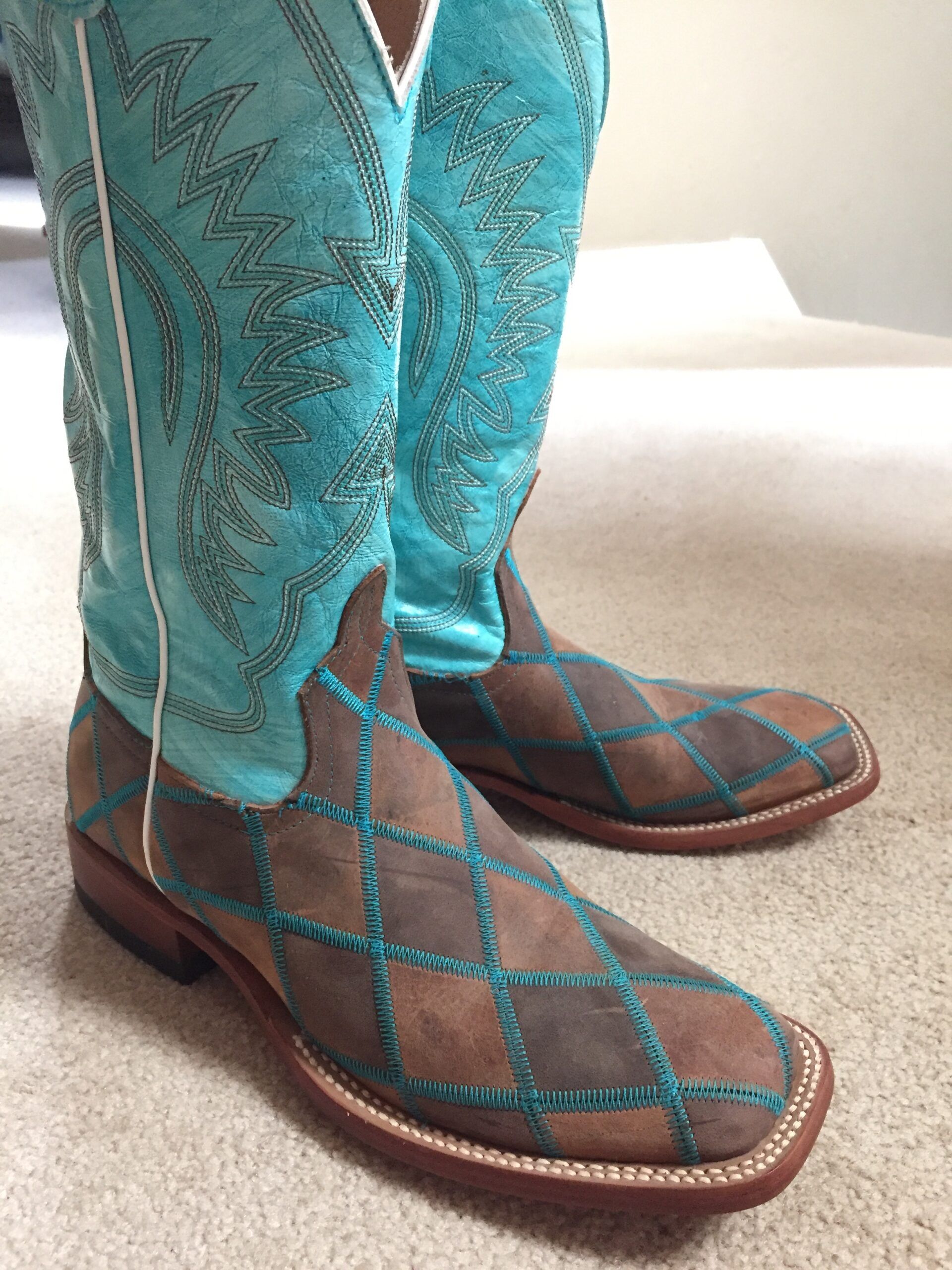 Distressed Brown & Chocolate Bison Patchwork Leather Foot w/ Turquoise Blue Quilted Stitch Pattern