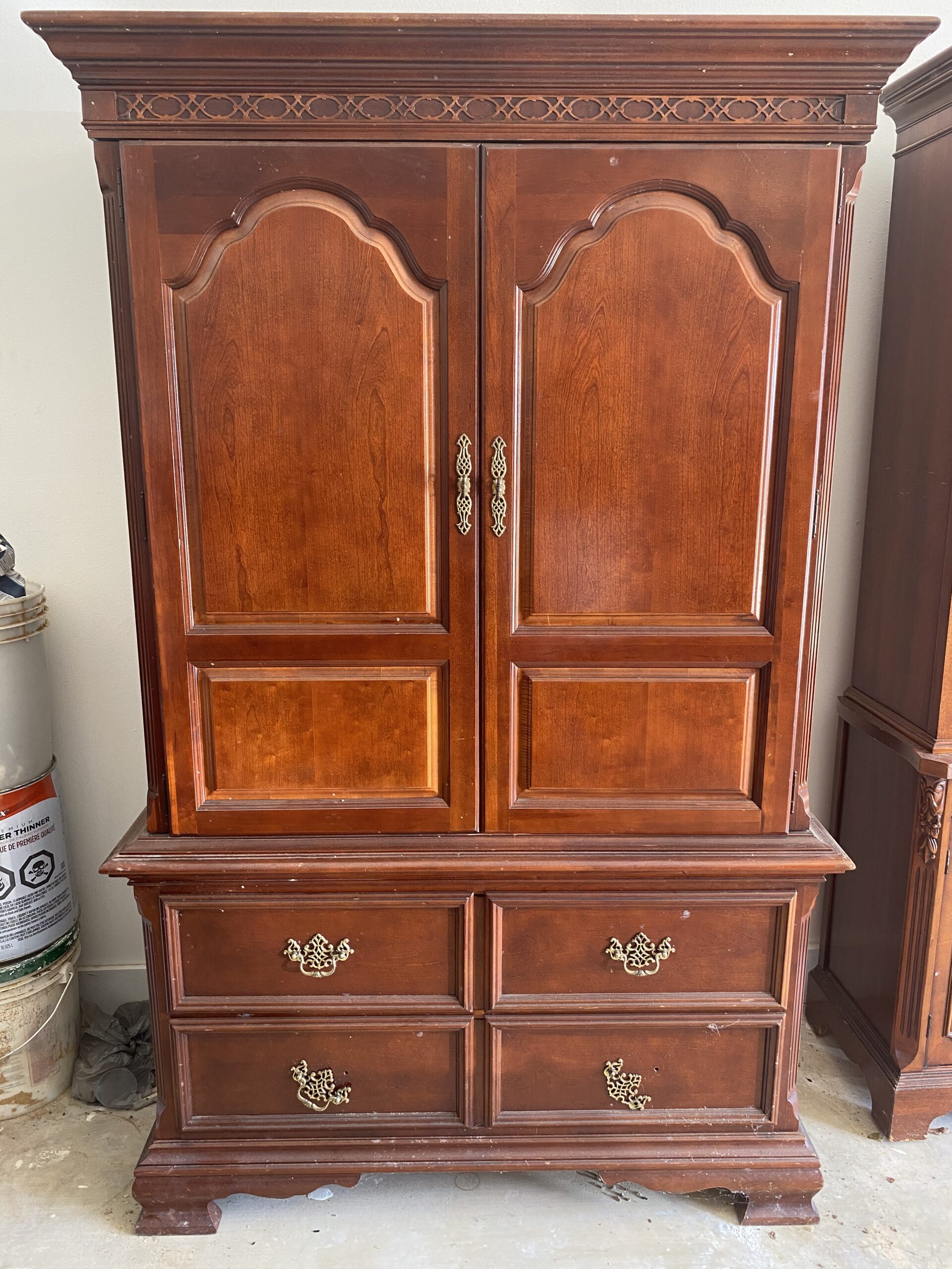 This classic, Stanley Brand, solid mahogany media cabinet is a gem. It has double hinged doors that swing out completely to be folded back on the sides of the cabinet. Drawers are fully functional. Could be used as is with some touch ups or restored beautifully into whatever you wanted!
