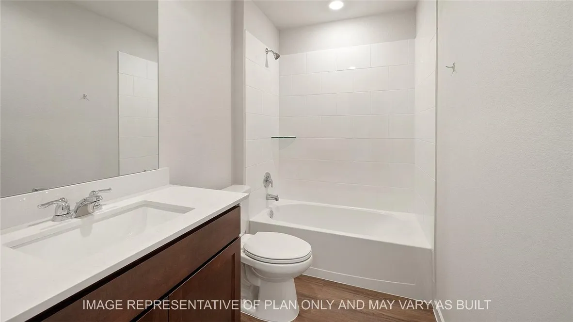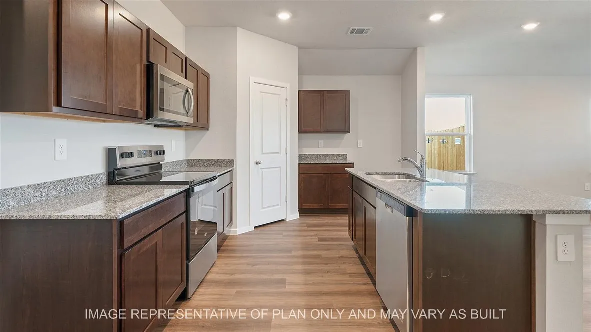 Enjoy the Lakeway at Knox Landing in Bryan, TX! This single-story home features 4 bedrooms, 3 bathrooms, and approximately 2,034 square feet of living space. Entering through the porch, you’re immediately greeted by the first secondary bedroom, bathroom, and study space. You’ll also find garage access and a storage closet. Moving past this section, you’re welcomed by the large, open-concept kitchen, dining, and living areas. This kitchen boasts modern shaker-style cabinetry, granite or quartz countertops, and stainless-steel appliances. Off the dining room are bedrooms 3 and 4, complete with closets and carpeted flooring. Bath 2 is located between these rooms for easy access and will include a tub/shower combo with ceramic tile surround and a quartz vanity. Towards the back of the home, off the living room, is the utility room and primary suite. This spacious bedroom has two windows, offering plenty of natural light, and a connected spa-like primary bathroom with a roomy walk-in closet. Also off the living room is your covered patio and fenced backyard, perfect for spending time outdoors.