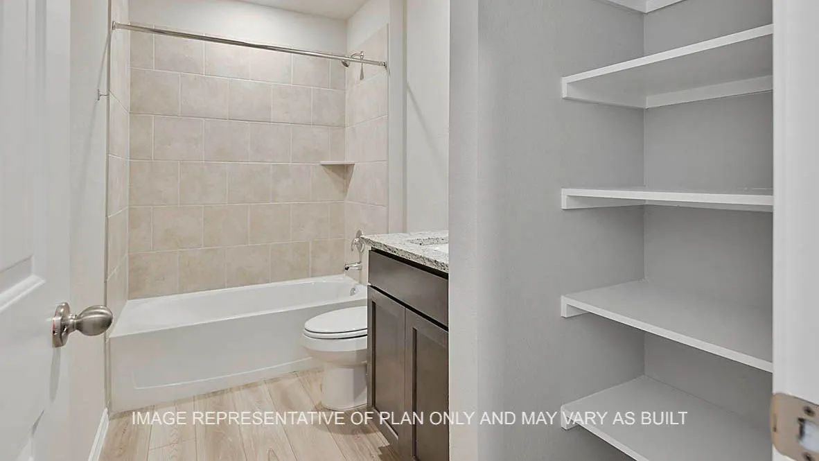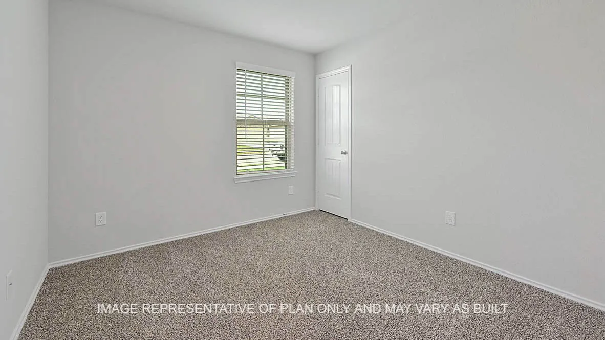 Introducing the Fargo floorplan at Knox Landing in Bryan, Texas. This 4-bedroom, 2-bathroom home features approximately 1,665 square feet of living space. Walking through the front door, you’re met with the first two secondary bedrooms with a shared landing space to the secondary bathroom. Each secondary bedrooms contains carpeted flooring and walk-in closets. The bathroom includes a shower/tub combo and a quartz vanity top. Continuing through the entry, you’ll find the third secondary bedroom along with a hall closet. Opposite to this bedroom is the utility room with garage access. Past this space is the open-concept kitchen, living, and dining areas. The kitchen is complete with granite or quartz countertops, stainless-steel appliances, and a spacious corner pantry. There is also an island great for hosting. Off the breakfast nook, is the back door to the covered patio and fenced backyard. Lastly, you’ll find the large primary bedroom through the living room. This bedroom has plenty of natural light with two windows to the backyard. It also has an attached bathroom, with a ceramic tile surround shower and vanity. You’ll always have plenty of storage space with not only a huge walk-in closet, but separate linen shelving as well.