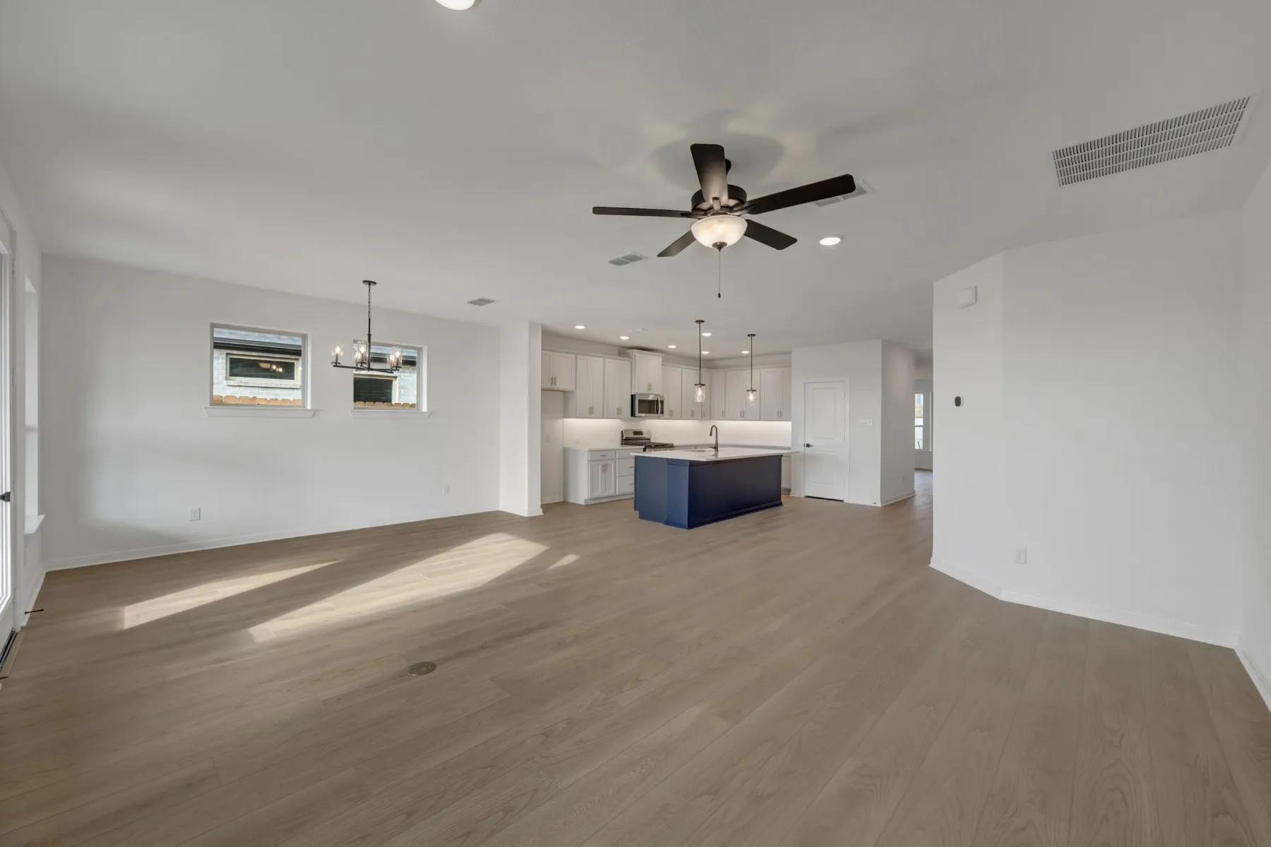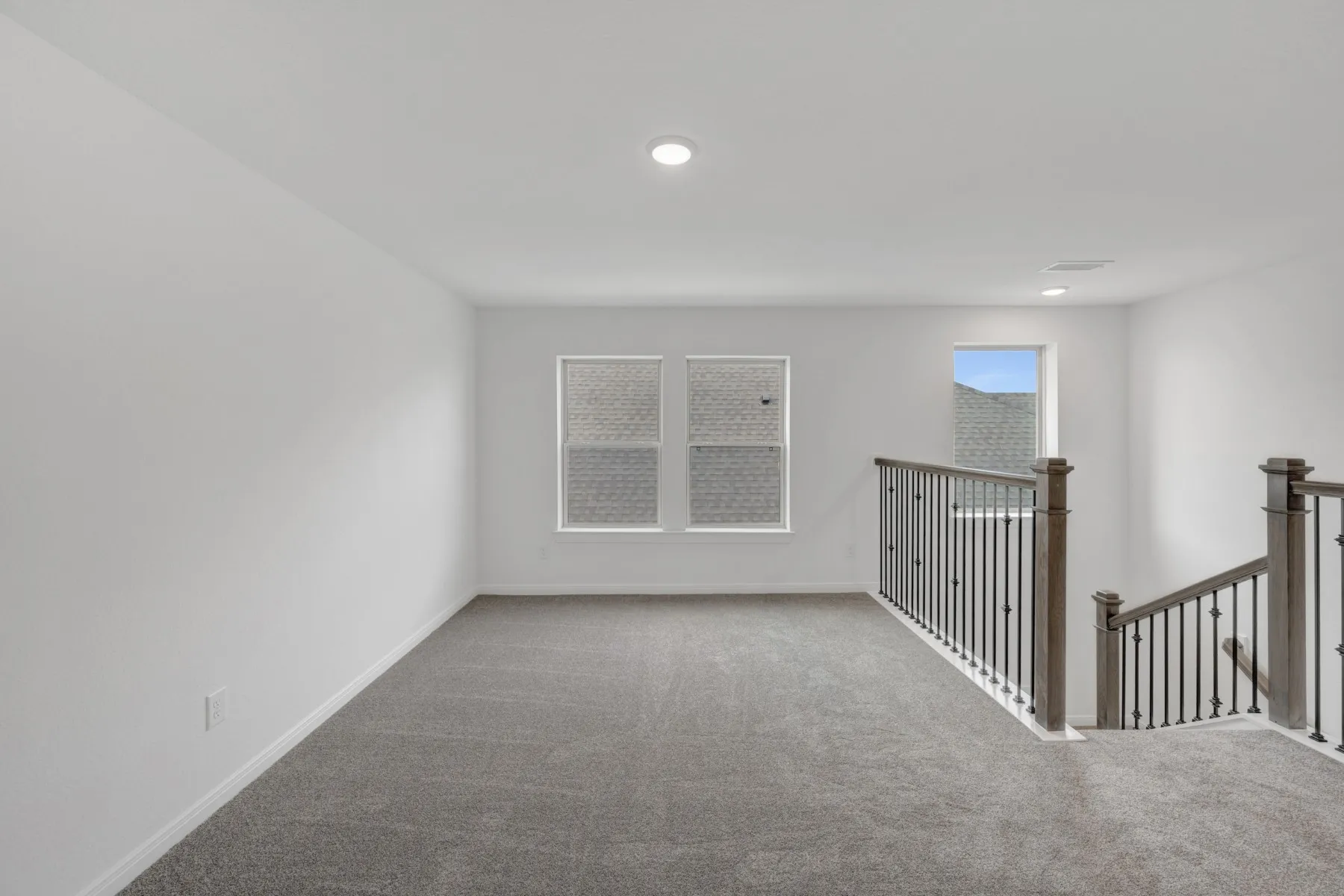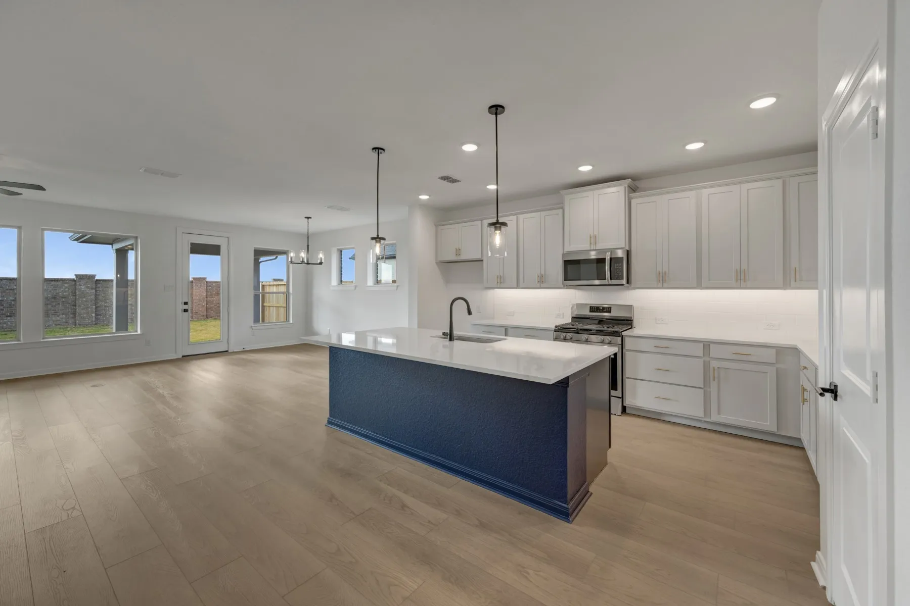 kitchen/family/dining. Kitchen boasts upgraded stainless appliances, island w/ pullout trash, under-cabinet lighting, and huge pantry extended under the stairs. Owner’s Suite includes tub, shower, and expansive walk-in closet. Upgraded iron stair railings lead to 2
